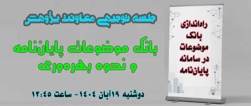 بهمنظور "تبیین قوانین و نحوه انتخاب موضوع از بانک موضوعات سامانه پایاننامه"، سومین جلسه توجیهی معاونت پژوهش مرکز آموزشهای غیرحضوری، بهصورت برخط (آنلاین) در روز دوشنبه 19 آبانماه 1404 از ساعت 12:45 تا 14:00 با درنظرگرفتن زمان جهت پاسخگویی به سؤالات طلاب گرامی برگزار خواهد شد.