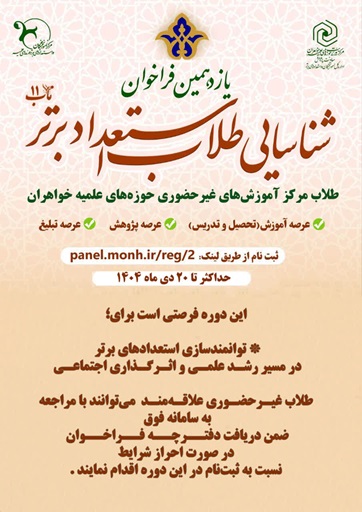 یازدهمین دوره شناسایی طلاب استعداد برتر حوزههای علمیه خواهران در سه عرصه آموزش (تحصیل و تدریس)، پژوهش و تبلیغ و امور فرهنگی از سوی ادارهکل امور نخبگان و استعدادهای برتر آغاز شد. طلاب مرکز آموزشهای غیرحضوری میتوانند با مراجعه به آدرس سامانه ذیل، ضمن دریافت دفترچه فراخوان، در صورت احراز شرایط، نسبت به ثبتنام در این دوره اقدام نمایند.