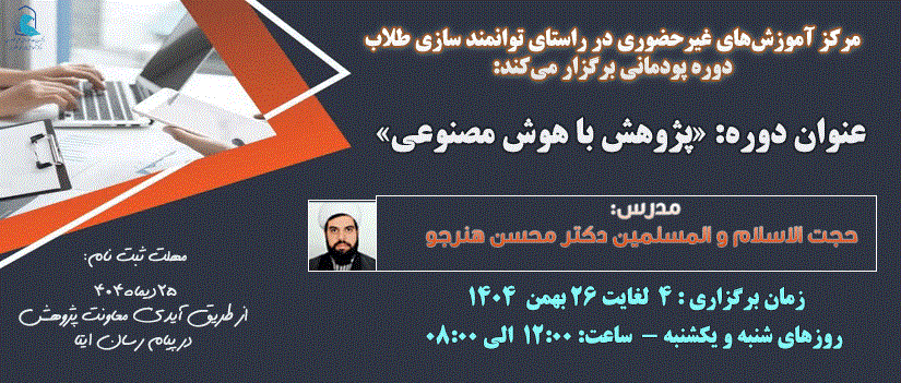 معاونت پژوهش مرکز آموزشهای غیرحضوری در راستای توانمند سازی طلاب در استفاده از روشها و ابزارهای جدید پژوهشی و تاثیر آن در تسریع و تسهیل نوشتن پایان نامهها، در نظر دارد دوره پودمانی با عنوان "پژوهش با هوش مصنوعی" را بهصورت برخط برگزار نماید.