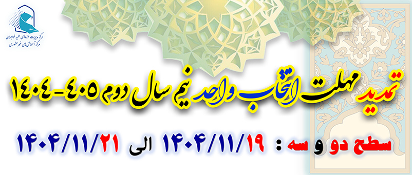 با توجه به مشکل سامانه در بازه زمانی انتخاب واح ، انتخاب واحد هردو مقطع سطح دو و سه از 19 تا 21 بهمنماه تمدید شد.